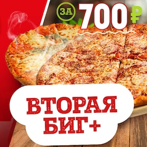 Выбери любые две большие 40 см пиццы — получи вторую пиццу за 700 рублей. Акция действует на доставке. Не распространяется на средние 33 см и малые 25 см пиццы. Скидки и акции не суммируются. В акции не участвуют: 4 сыра, Миланская, Морская, Груша и Горгонзола.