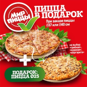 Во всех ресторанах (только в ресторанах, не распространяется на доставку и самовывоз) сети «Мир Пиццы» действует акция: закажите большую пиццу — получите маленькую в подарок!